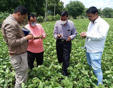 नांदेड : परभणी येथील वसंतराव नाईक मराठवाडा कृषी विद्यापीठाचे शास्त्रज्ञ डॉ. अनंत बडगुजर व डॉ. मिलिंद सोनकांबळे यांनी कंधार तालुक्यातील शिवारात भेटी दिल्या. यावेळी त्यांनी शेतकर्यांना कीड- रोगासंदर्भात मार्गदर्शन केले. पिकावरील किड रोग सर्वेक्षण व सल्ला प्रकल्प ( क्रॉपसॅप ) अंतर्गत कंधार तालुक्यातील कंधार, बाळंतवाडी, गुलाबवाडी, घोडज, गंगणबीड, बाभुळगाव आदी गावांना शास्त्रज्ञांनी भेटी दिल्या. Scientis -from -Parbhani- Agricultural- University- on Nanded- farm