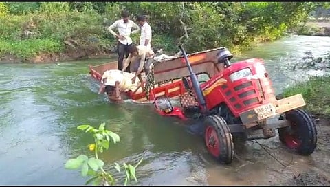 वाशिम : ग्रामीण भागातील Rural Area शेतात जाणारे पांदण रस्ते चिखमय झाले असून, नाल्यावर पूल नसल्याने शेतकऱ्यांना नाहक त्रास सहन करावा लागत आहे. अशाच वाशिम तालुक्यातील Washim Taluka केकतउमरा येथील शेतकरी प्रकाश गौर आणि गजानन तडस या शेतकऱ्यांचे काढलेले सोयाबीन ट्रॅक्टरमध्ये Soybean घरी आणत असतांना ट्रॅक्टर Tractor नाल्यात फसल्याने ट्रॅक्टरमधील सोयाबीन पाण्यात भिजले तर काही पोते पाण्याच्या प्रवाहात वाहून गेले आहे. (Soybeans soaked in water while some were carried away in the stream of water)
