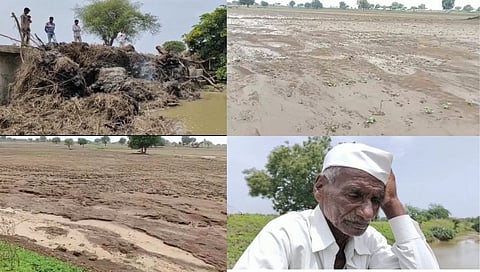 या गाव शिवारातून खराडी नावाची नदी आहे. या नदीवर पाटबंधारे विभागाच्या माध्यमातून, कोल्हापुरी स्वरूपाचा बंधारा, गेल्या पाच ते सहा वर्षांपूर्वी बांधलेला आहे. या बांधलेल्या बंधाऱ्यामुळे शेतकऱ्यांना फायदा होणं तर लांबच, उलट या बंधाऱ्या लगत असणाऱ्या, जळपास 20 शेतकऱ्याच्या, 20 ते 25 एक्कर शेतीला याचा फटका बसतोय. शेतीसह उभी पिकं वाहून जात आहेत. या बंधाऱ्याला व्यवस्थित दारं नसल्याने आणि नदीतून वाहून आलेले सरपण, कस्तान, बंधाऱ्याला आडलं जातं आणि यामुळे हा बंधारा तुंबून, नदीचं पात्र बऱ्याच ठिकाणी फुटल्याने, हे पाणी या शेतकऱ्यांच्या शेतीत गेले आणि पूर्ण पिकांसह शेत वाहून गेलं आहे. यामुळं या शेतकऱ्याचं प्रचंड आर्थिक नुकसान झालं आहे.