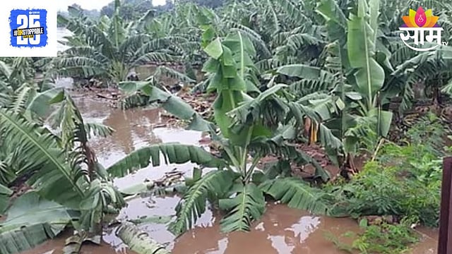 जळगाव : प्रसिद्ध असलेली जळगावची केळी या वर्षी पुन्हा एकदा अतिवृष्टीच्या संकटात सापडली आहे. गेल्या काही दिवसांपासून सतत सुरू असलेल्या मुसळधार पावसामुळे जळगाव जिल्ह्यातील अनेक शेतांमध्ये पाणी साचले असून गिरणा नदीला आलेल्या पूराचे पाणी शेतात घुसल्याने शेकडो केळीची झाडे जमीनदोस्त झाली आहेत. तयार झालेली केळीची घड मातीत पडून नष्ट होत असल्याने शेतकऱ्यांवर आर्थिक संकट ओढावले आहे.