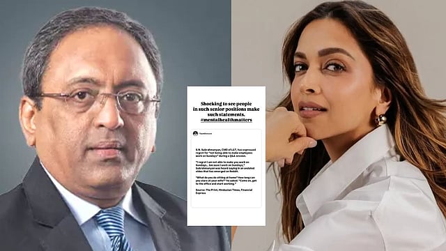 L&T चे चेअरमन एसएन सुब्रमण्यम यांच्या या वक्तव्यावर अभिनेत्री दीपिका पदुकानने नाराजी व्यक्त केली आहे. दीपिका पदुकोनने फये डिसूझा यांची पोस्ट शेअर करत त्यावर आपले मत मांडले आहे. दीपिकाने पोस्टवर लिहलंय की, एवढ्या मोठ्या पदावरील लोक अशी विधाने करतात हे पाहून धक्का बसला. त्यानंतर दीपिकाने #MentalHealthMaatters असंही म्हटलं आहे. (Deepika Post On L&T Chairman subramanyam)