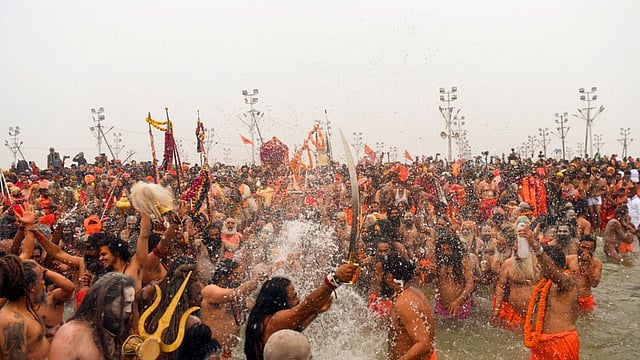 निरंजनी आखाड्याचे नागा साधू मंगळवारी प्रयागराजमध्ये महाकुंभ 2025 दरम्यान 'मकर संक्रांती' निमित्त त्रिवेणी संगम येथे 'शाही स्नान' घेतात.