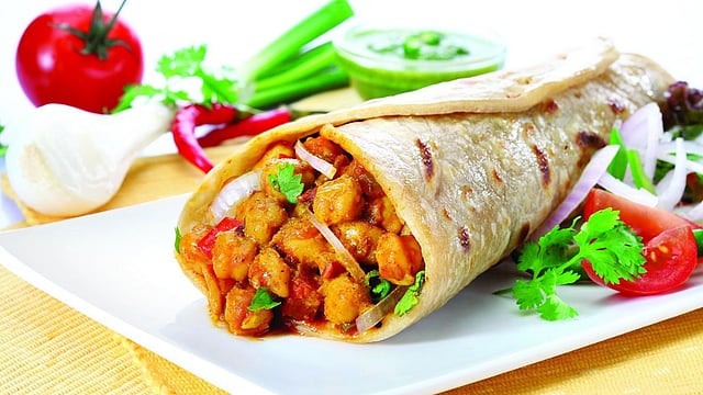 रुमाली रोटी एका प्लेटमध्ये ठेवा.रोटीवर टोमॅटो केचप आणि पुदिन्याची चटणी पसरवा.तयार केलेला मसाला रोटीमध्ये टाका.रोटी लाटून सर्व्ह करा.