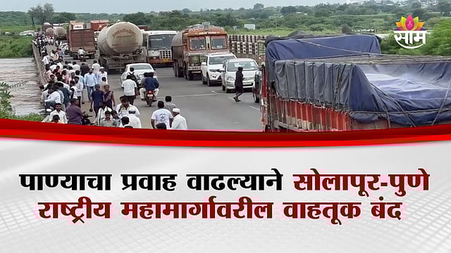 मागील चार दिवसांपासून सोलापूरमध्ये पावसाने धुमाकूळ घातला आहे. त्यात कोळेगाव येथील धरणातून मोठ्या प्रमाणात विसर्ग सोडण्यात आला आहे. त्यामुळे सीना नदीचा प्रवाह मोठ्या प्रमाणात वाढला. अनेक पूल पाण्याखाली जाण्याची भीती व्यक्त करण्यात येत आहे. त्यामुळे खबरदारीमुळे महामार्ग बंद करण्यात आला आहे. पावसामुळे शेताला नदीचे स्वरूप आलेय. शेतकऱ्यांच्या हातातोंडाशी आलेला घास हिरावला गेलाय. त्यात आता महामार्गही ठप्प झालाय.