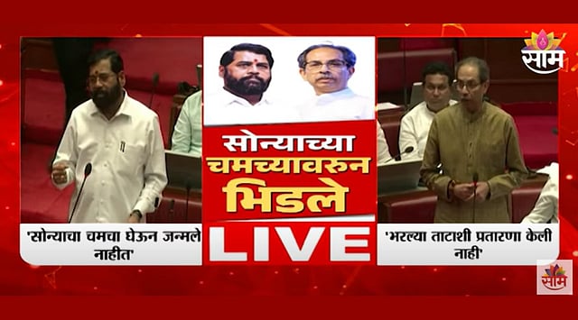 एकनाथ शिंदे यांनी सोन्याचा चमचा घेऊन जन्म यावरुन प्रत्यक्ष-अप्रत्यक्षरित्या उद्धव ठाकरे यांना टोला लगावला. यावर पुढे उद्धव ठाकरे यांनीही पलटवार केला. अनेकजण तडफडत असतात, मला पद मिळालं पाहिजे, माझं पद टिकलं पाहिजे. पद टिकवण्यासाठी म्हणजे आता जरा उल्लेख झाला अंबादास तुम्ही सोन्याचा चमचा घेऊन जन्माला आला नाहीत, पण तुम्ही भरलेल्या ताटाशी प्रतारणाही केली नाहीत. ज्यांनी ताट भरुन दिलं, त्या पक्षाशी प्रतारणाही केली नाहीत. ताटात जे आहे ते माझंच आहे, पण आणखी मिळावं म्हणून दुसऱ्या रेस्टॉरंटमध्ये जायचं असा अपराध तुम्ही केला नाही, असा अपराध तुम्ही केला नाही, त्याबद्दल सगळी जनता तुम्हाला धन्यवाद देत असेल, असे उद्धव ठाकरे यांनी म्हटले.