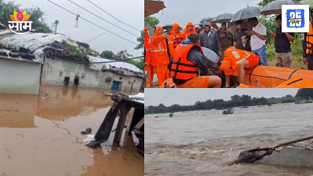 गेल्या काही तासांपासून राज्यभरात पावसानं थैमान घातलं आहे. मराठवाड्यातील काही भागांमध्येही पावसानं हाहाकार माजवला आहे. मुसळधार पावसामुळे नांदेडमधील परिस्थिती चिंताजनक झाली आहे. नांदेडमधील अनेक गावांना पुरानं वेढा घातला आहे. रविवारी रात्री ढगफुटीसदृश पाऊस बरसला आहे. संततधार कोसळणाऱ्या पावसामुळे सहा गावं पाण्याखाली गेले आहेत. यापैकी २ गावातील ८० नागरिक अडकले आहेत. तर, ४० ते ५० म्हशींचा मृत्यू झाला आहे.
