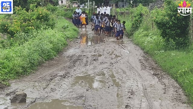Children wade through mud and fields to reach school in Dahgaon village, Chandwad Taluka — a reality despite decades of independence and development promises. Saam Tv