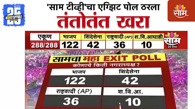 साम टीव्हीने महा एक्झिट पोल घेतला होता. पुणे, नाशिक, ठाणे, नागपूर आणि कोल्हापूरपासून जळगाव आणि वर्धासह राज्यभरात कोणत्या पालिकेवर कोणाची सत्ता? कोण होणार नगराध्यक्ष? हे जाणून घेतलं होतं. या एक्झिट पोलमधून २८८ संभाव्य नगराध्यक्षांची यादी जाहीर केली होती.