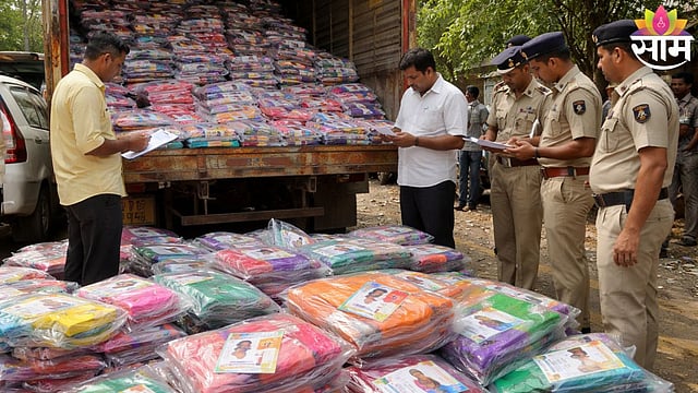 Flying squad officials inspecting seized sarees allegedly meant for voter inducement ahead of ZP elections in Kolhapur. Saam Tv
