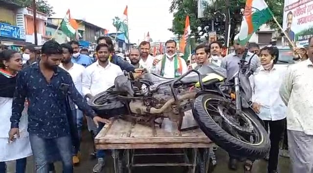 गेल्या काही दिवसांपासून पेट्रोल, डिझेल यासह सर्वच इंधनांचे भाव मोठ्या प्रमाणात वाढले आहेत. prteol, disel price hike त्यामुळे सर्वसामान्यांना पेट्रोल आणि डिझेल भरण्याच्या नावाने अक्षरशः धडकी भरू लागली आहे. देशात काँग्रेसची सत्ता असताना इंधनाचे भाव थोडे जरी वाढले, तरी भाजपकडून आंदोलनं केली जायची, मात्र आता पेट्रोलचे भाव शंभर रुपयांच्या पुढे गेले असून भाजप 'अबकी बार शंभरी पार' असा अजेंडा agenda राबवत आहे का? असा प्रश्न अंबरनाथचे काँग्रेस शहराध्यक्ष प्रदीप पाटील यांनी केला. यावेळी काँग्रेस कार्यालयाबाहेर चक्क एका दुचाकीला झाडाला दोरी बांधून फाशी देण्यात आली. तसंच या दुचाकीची अंबरनाथच्या तहसीलदार tahsildar of ambernath कार्यालयापर्यंत हातगाडीवर प्रतिकात्मक अंत्ययात्रा Symbolic funeral काढण्यात आली.
