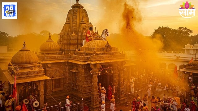 Devotees gather near the steps of Jejuri Temple moments after a fire broke out during the Bhandara celebration. Saam Tv
