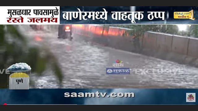 पुण्यामध्ये झालेल्या मुसळधार पावसामुळे अगदी तासाभरात रस्त्यांना नदीचे स्वरूप आले. पुण्यातील बाणेरमध्ये असणाऱ्या सकाळनगर परिसरात या पावसामुळे सगळीकडेच पाणी पाणी झाले. याठिकाणी रस्त्यावर गुडघाभर पाणी साचले. त्यामुळे बाणेर परिसरात मोठी वाहतूक कोंडी झाली आहे. या पाण्यातूनच कशी तरी वाट काढत वाहन चालक जात आहेत.