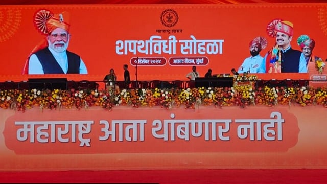 दरम्यान, महायुतीच्या शपथविधी सोहळ्यात भगवा रंग आकर्षणाचा मुद्दा ठरला आहे. शपथविधी सोहळ्याला बांधण्यात आलेल्या तीनही पंडालचे कापड भगवे असल्याचे पाहायला मिळत आहे. त्यामुळे हिंदुत्व आणि भगवा रंग याचीच चर्चा राजकीय वर्तुळात सुरु आहे. या शपथविधी सोहळ्याला वेगवेगळ्या मान्यवरांची हजेरी पाहायला मिळणार आहे. या सोहळ्याला राज्यातील विविध भागातील लाडक्या बहिणी देखील हजेरी लावणार आहेत. सर्व महिला या भगव्या रंगाच्या साड्या परिधान करुन शपथविधी सोहळ्याला उपस्थित असल्याचं पाहायला मिळत आहे.