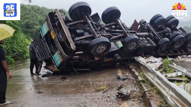 अपघातग्रस्त कंटेनर रस्त्यात आडवा झाल्यानं वाहतुकीला अडथळा.