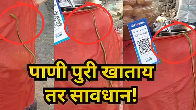 व्हायरल झालेल्या व्हिडिओमध्ये पाहायला मिळत आहे की, रस्त्यावर एक पाणी पुरीचा ठेला लागला आहे. या ठेल्याच्या मागे भरपूर कचरा आहे. आणि काहीजण या ठेल्यावर पाणी पुरी खाण्यासाठी आलेले पाहायला मिळत आहेत. याचदरम्यान पाणी पुरीच्या ठेल्यावर एक हिरव्या रंगाचा साप लाल कपड्याच्या आतून येताना दिसतो आहे.
