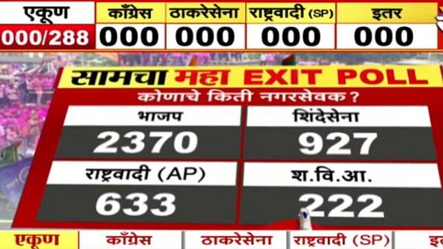 २८८ नगरपरिषद आणि पंचायतीच्या निवडणुकीचा हा अंदाज साम टीव्हीच्या महा एक्झिट पोलचा आहे. आम्ही मतदारांकडून फक्त कल जाणून घेतलाय. हा अंतिम निकाल नसून विजयी उमदेवाराची अधिकृत घोषणा २१ डिसेंबर रोजी आयोगाकडून करण्यात येईल.