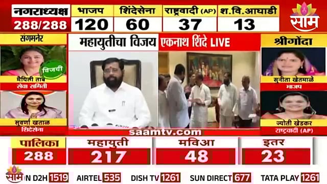 नगरपालिका आणि नगरपरिषदेमध्ये भाजप आणि शिंदेंच्या शिवसेनेला पुन्हा एकदा अभूतपूर्व यश मिळाल्याचे चित्र स्पष्ट झाले आहे. भाजप एक नंबरचा तर शिवसेना दोन नंबरचा पक्ष ठरला आहे. संपूर्ण राज्यात सध्या महायुतीचा जल्लोष पाहायला मिळत आहे. ठिकठिकाणी गुलाल उधळत असून महापालिकेवर देखील महायुतीचाच झेंडा फडकेल असा विश्वास उपमुख्यमंत्री एकनाथ शिंदे यांनी व्यक्त केला आहे. तसेच त्यांनी राज्यातील लाडक्या बहिणी आणि लाडक्या भावांना धन्यवाद दिले. पाहा व्हिडिओ