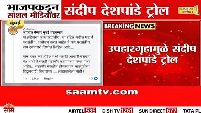 भाजपच्या कार्यकर्त्यांनी महाराष्ट्र नवनिर्माण सेनेचे नेते संदीप देशपांडे यांची कोंडी केली आहे. देशपांडे यांना त्यांच्या उपहारगृहावरून ट्रोल केलं जातंय. संदीप देशपांडे हे मराठी भाषा, स्थानिक भूमिपुत्रांना नोकरीमध्ये हक्क, हे मुद्दे त्यांनी कायम लावून धरले होते. अलिकडच्या काळात त्यांनी मराठी भाषेवरून अनेकदा भाजपची कोंडी केली. मात्र, आता भाजप कार्यकर्ते देशपांडे यांना त्यांच्या उपहारगृहावरून ट्रोल करत आहेत.