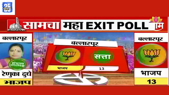 चंद्रपूर जिल्ह्यातील बल्लारपूर नगरपालिकेत कोण नगराध्यक्ष होणार आणि कुणाची सत्ता येणार, याकडे साऱ्यांचं लक्ष लागलं आहे. एक्झिट पोलनुसार, बल्लारपूरमध्ये भाजपची सत्ता येण्याची शक्यता व्यक्त करण्यात आली आहे. तर संभाव्य नगराध्यक्ष रेणुका दुधे यांचं नाव आघाडीवर आहे. या भागात भाजपचे तेरा नगरसेवक निवडून येण्याची शक्यता आहे. त्यामुळे बल्लारपूरमध्ये भाजपची सत्ता येण्याची शक्यता या ठिकाणी वर्तवली गेली आहे.