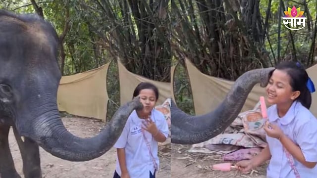 लहान मुलगी आधी हत्तीला आईस्क्रीम देण्यासाठी पुढे जाते. यावेळी ती मुलगी तिच्या गालाकडे बोट दाखवत ‘पापी’ घेण्याचा इशारा करते. हे पाहताच बेबी हत्ती आपल्या सोंडेने मुलीच्या गालाला हलकाच स्पर्श करतो. हा क्षण पाहून आसपासचे लोकही आनंद व्यक्त करताना दिसतात.