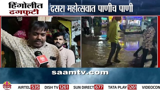 हिंगोलीतील सार्वजनिक दसरा महोत्सवावर मुसळधार पावसाने अक्षरश: पाणी फेरले आहे. देशातील क्रमांक दोन मानल्या जाणाऱ्या या दसरा उत्सवात यावर्षी महाराष्ट्रासह इतर राज्यांतून आलेल्या व्यापाऱ्यांनी मोठ्या प्रमाणात आपले स्टॉल लावले होते. मात्र रात्री सुमारे आठच्या सुमारास अचानक ढगफुटी सदृश पावसाने हाहाकार माजवला. या मुसळधार पावसामुळे अनेक व्यापाऱ्यांचे साहित्य भिजून मोठ्या प्रमाणात नुकसान झाले आहे. नागरिकांना देखील पावसापासून बचाव करण्यासाठी धावपळ करावी लागली. व्यापाऱ्यांनी मोठ्या खर्चाने आणलेले साहित्य पावसात नष्ट झाल्याने त्यांच्यावर मोठे आर्थिक संकट कोसळले आहे. अचानक आलेल्या या पावसामुळे उत्सवाचा उत्साह कमी झाला असून प्रशासन आणि आयोजकांकडून नुकसानग्रस्त व्यापाऱ्यांना मदतीची मागणी होत आहे.