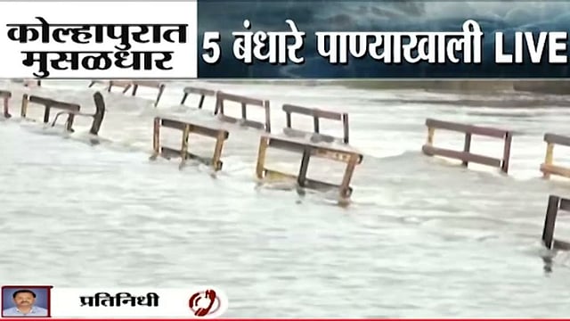 राज्यात कालपासून मुसळधार पाऊस पडत आहे. मुंबई, पुणे, कोल्हापूर, सांगलीला पावसाने अशरक्षः झोडपून काढले आहे. कोल्पूरात तर अनेक ठिकाणी रस्त्यांना नद्यांचे स्वरुप आले आहे. कोल्हापूर शहरासह जिल्ह्यात गेले पाच दिवस मुसळधार पाऊस पडत आहे. जिल्ह्यातील पाच बंधारे पाण्याखाली गेले आहेत.राजाराम बंधाऱ्यासह रुई, इचलकरंजी, येवलुज, शिरोळ हे बंधारे पाण्याखाली आहेत. राजाराम बंधारा इथं पाणी पातळी 17 फुटांवर आहे. मुसळधार पावसामुळे कोल्हापुरातील गांधी मैदानाचं झालं रूपांतर तळ्यात झालं आहे.कोल्हापूर शहराच्या मध्यवर्ती ठिकाणी असणारे गांधी मैदान पाण्याने काठोकाठ भरले आहे.कोल्हापूरातील पावसामुळे शेतीतदेखील पाणी घुसले आहे. यामुळे शेतकऱ्यांचेही मोठे नुकसान झाले आहे. कोल्हापूरात अजूनही पावसाची संततधार सुरु आहे. (Kolhapur Rain Alert)
