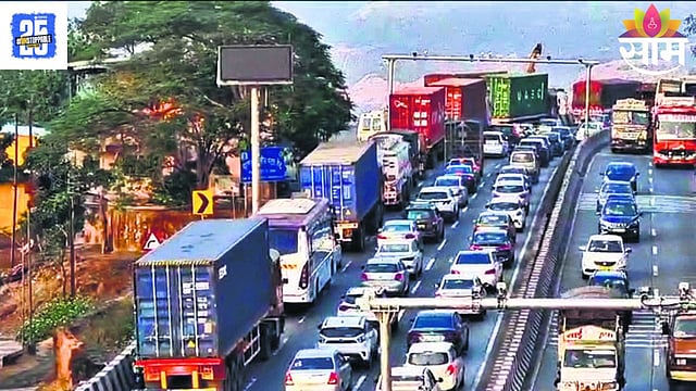 Six-kilometre-long traffic jam on the Mumbai–Pune Expressway near Amrutanjan Bridge as devotees and weekend travellers struggle through heavy congestion. Saam Tv