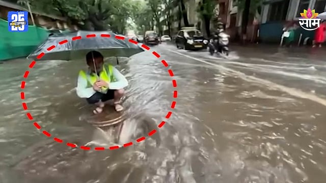 मुंबईमध्ये मध्यरात्रीपासून मुसळधार पाऊस पडत आहे. या पावसामुळे मुंबईच्या अनेक सखल भागात पाणी साचले. दादर येथील स्टेशन लगत असलेल्या हिंदू कॉलनीमध्ये देखील मोठ्या प्रमाणात पाणी साचल्याचे पाहायला मिळाले. ही कॉलनी स्टेशनला लागून असल्यामुळे या विभागात वाहनांची आणि नागरिकांची रहदारी मोठ्या प्रमाणात पाहायला मिळते. त्यातच त्याठिकाणी मोठा प्रमाणात पाणी साचले होते. म्हणून पालिका कर्मचाऱ्याने चक्क मॅनहोल उघडून त्याच्या शेजारीच छत्री घेऊन बसल्याचे पाहायला मिळाले. पाण्याचा निचरा होत नाही तोपर्यंत हा कर्मचारी त्याठिकाणीच बसून होता. याचा व्हिडीओ समोर आला असून तो सोशल मीडियावर व्हायरल होत आहे.