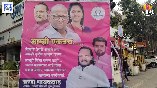 Pune banner of Sharad Pawar, Ajit Pawar, and Supriya Sule with message “We Are Together” sparks statewide political chatter saam tv