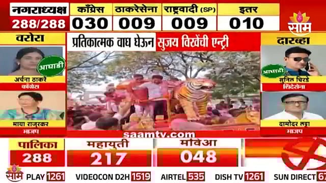 BJP leader Sujay Vikhe Patil makes a grand entry in Shirdi with a symbolic tiger as party celebrates a strong lead in municipal elections. Saam Tv