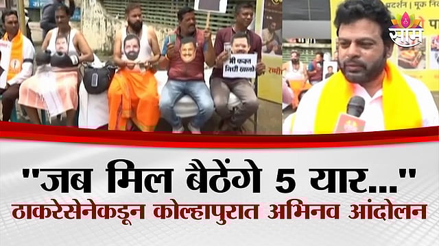 शिवसेना ठाकरे गटाच्या वतीने कोल्हापुरात अभिनव आंदोलन करण्यात येत आहे. कोल्हापुरातील दसरा चौक परिसरात 'जब मिल बैठेंगे पाच यार' या टॅगलाईन खाली शिवसैनिकांनी लक्ष वेधलं आहे. कृषिमंत्री रमी मास्टर कोकाटे, बनियन टॉवेल स्पेशालिस्ट संजय शिरसाट, ओम भट स्वाहा भरत शेठ गोगावले, बनियन टॉवेल बॉक्सर संजय गायकवाड आणि शंभर कोटी घोटाळे बहाद्दर राजेश क्षीरसागर यांचं पोस्टर लावून दसरा चौक इथे मुख आंदोलनाला सुरुवात झालेली आहे. या आंदोलनात सर्व कार्यकर्त्यांनी बनियन, टॉवेल तसेच हातात बॉक्सिंग किट घालून सहभागी झाले आहेत.