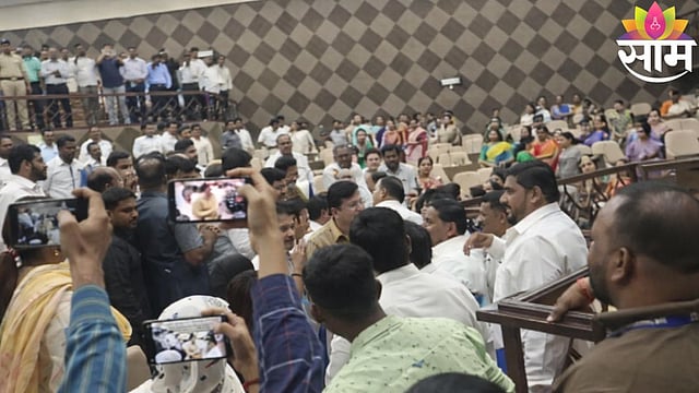 BJP councillors protesting loudly as Shinde faction members continue the council session in Thane. Saam Tv