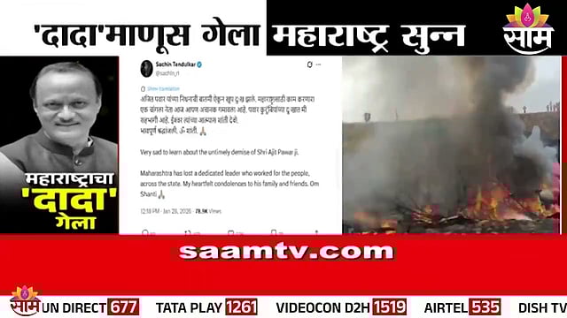 टीम इंडियाचा माजी खेळाडू सचिन तेंडुलकर याने अजित पवारांच्या निधनावर शोक व्यक्त केला आहे. सचिन तेंडुलकरने यासंदर्भात ट्विट केलंय. सचिन म्हणतो, अजित पवार यांच्या निधनाची बातमी ऐकून खूप दुःख झाले. महाराष्ट्रासाठी काम करणारा एक चांगला नेता आज आपण अचानक गमावला आहे. पवार कुटुंबियांच्या दुःखात मी सहभागी आहे. ईश्वर त्यांच्या आत्म्यास शांती देवो. भावपूर्ण श्रद्धांजली. ॐ शांती.