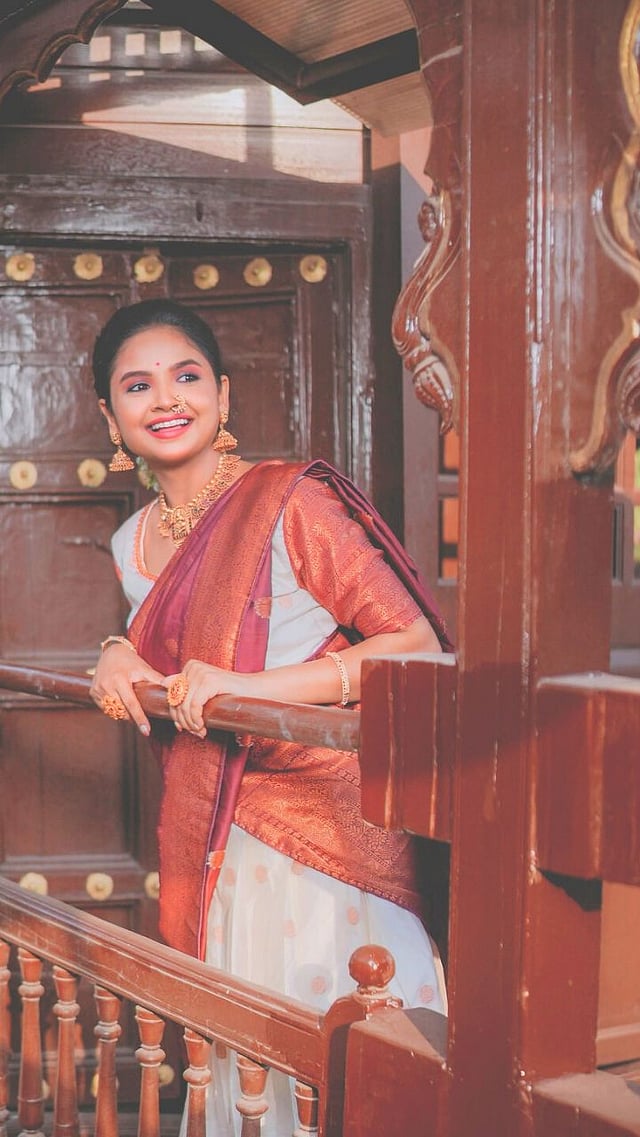 अपूर्वाने या साडीवर साउथ इंडियन ज्वेलरी घातली आहे. ती या लूकमध्ये खूपच सुंदर दिसत आहे.