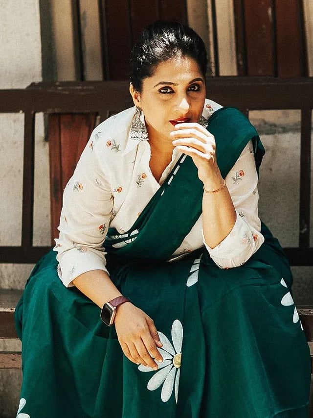 मधुराणीने व्हाईट कलरचे टी-शर्ट आणि त्यावर हिरव्या रंगाची साडी नेसली होती.