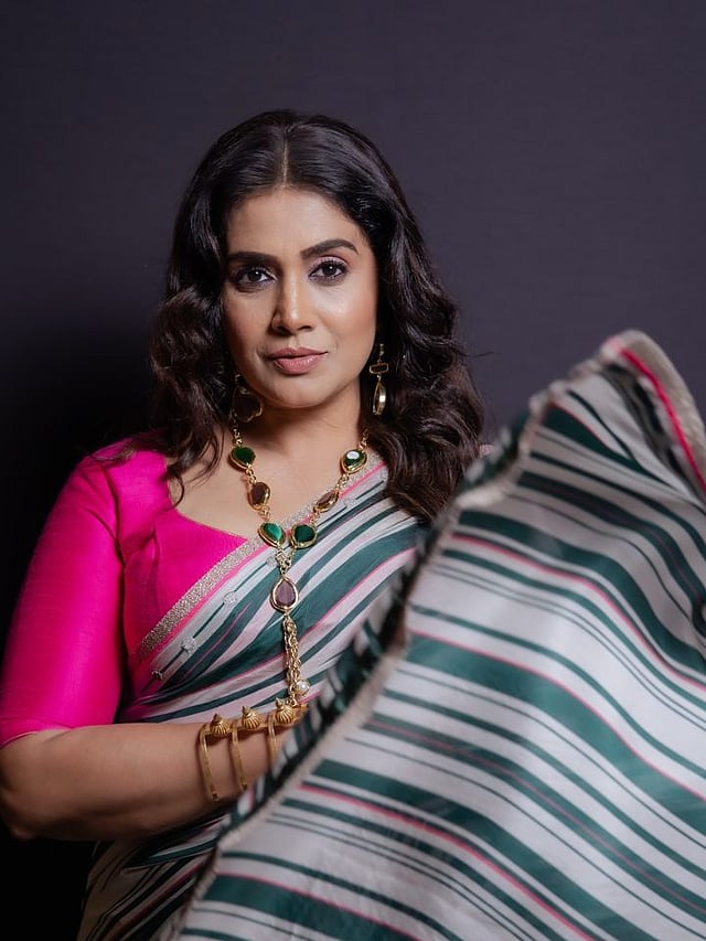 सोनालीने साडी नेसली आहे. तिने मिनिमल मेकअप आणि केसांची स्टाईल केली आहे.