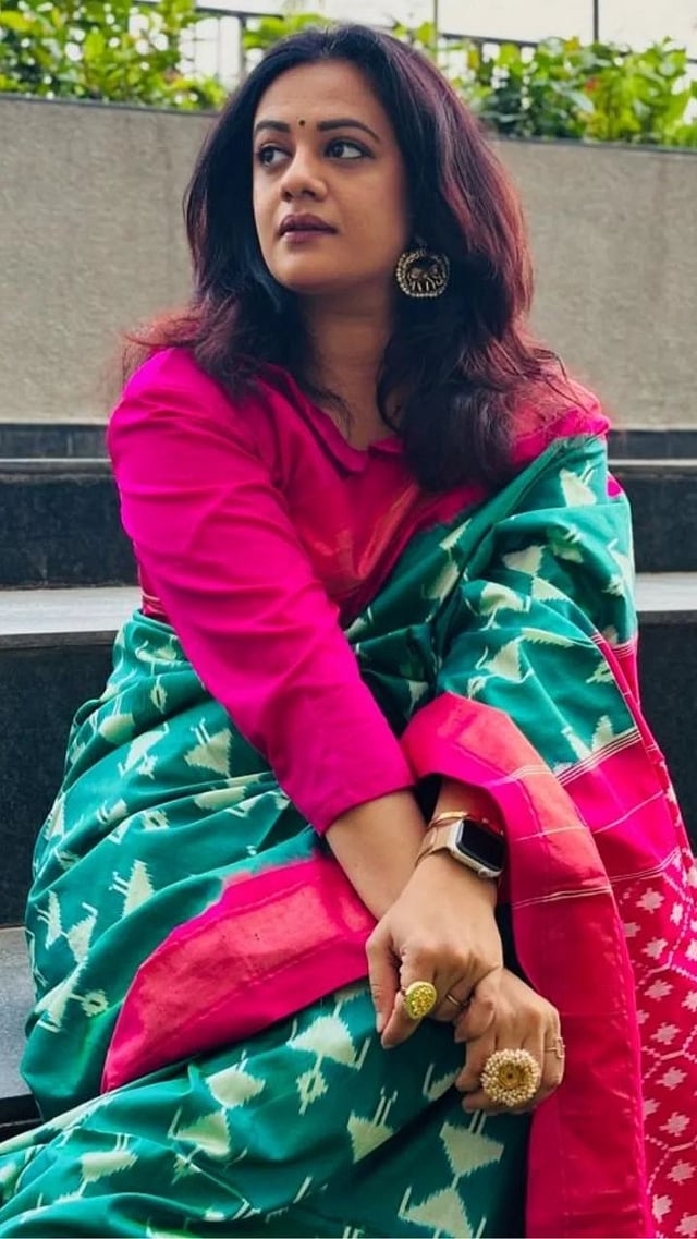 स्पृहाने छान ग्रीन कलरची काठपदर साडी नेसली आहे. त्याला पिंक कलरची बॉर्डर आहे.