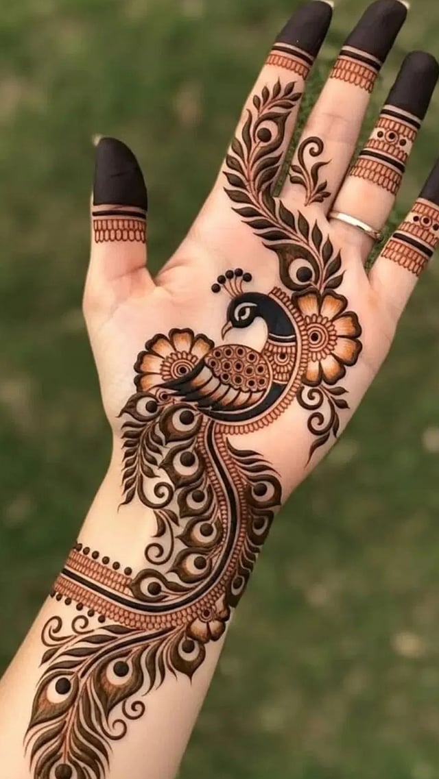 फुल हँड मेहेंदीचे डिझाइन खूप सुंदर दिसतात. त्यात मोर, फुलांचा नाजूक नमुना तयार करण्यात आला आहे. या डिझाइनमध्ये हाताचा प्रत्येक भाग सुबकपणे भरलेला असल्याने ते आकर्षक आणि पारंपरिक वाटतं.