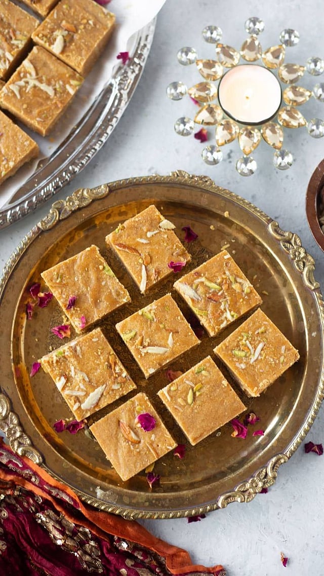 बेसन – १ कप, साखर – ¾ कप, तूप – ½ कप, पाणी – ¼ कप, वेलदोडा पूड आणि सुकामेवा – या साहित्यासह रेसिपी सुरू होते.