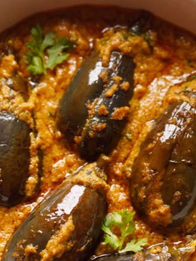 यानंतर कढईत तेल गरम करा. त्यात मोहरी, हिंग, कढीपत्ता आणि कांदा परतून घ्या. यानंतर तेलात भरलेले वांगी टाका.