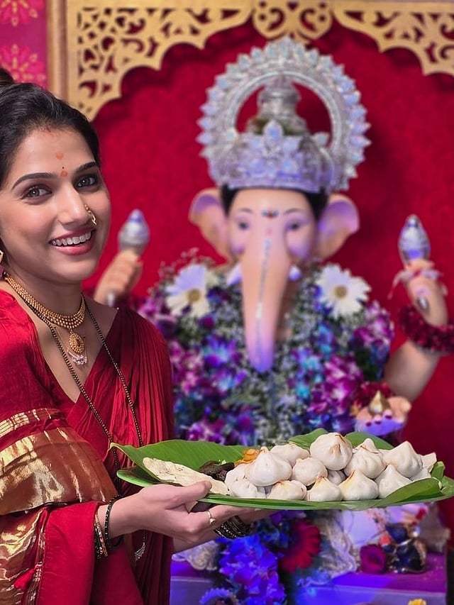 गणपत्ती बाप्पाला मोदक अर्पण करतानाचे हे तिचे भक्तीमय फोटो आहेत.