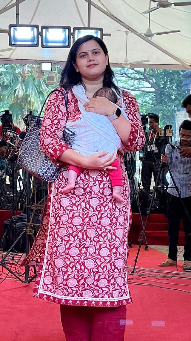 भाजप आमदार नमिता मुंदडा यांनी आपल्या दोन महिन्यांच्या बाळाला कडेवर घेऊन विधीमंडळाच्या अधिवेशनाला हजेरी लावली.