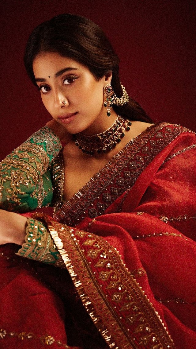 जान्हवी कपूरने नुकताच एका इव्हेंटमध्ये लाल रंगाची साडी आणि हिरव्या रंगाचा ब्लाऊज परिधान केली होती.