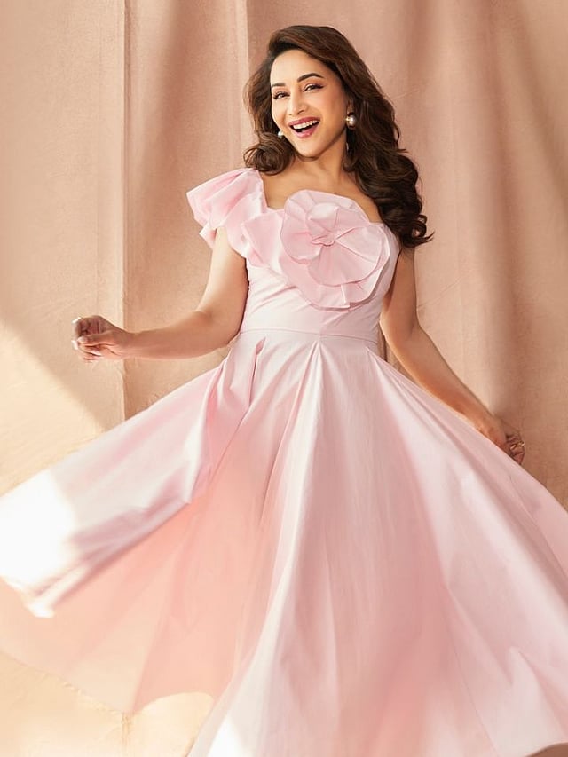 माधुरी दीक्षितने बेबी पिंक रंगाचा सुंदर वेस्टन ड्रेस परिधान केला आहे. ज्यावर मोठे गुलाबाचे फुल पाहायला मिळत आहे.