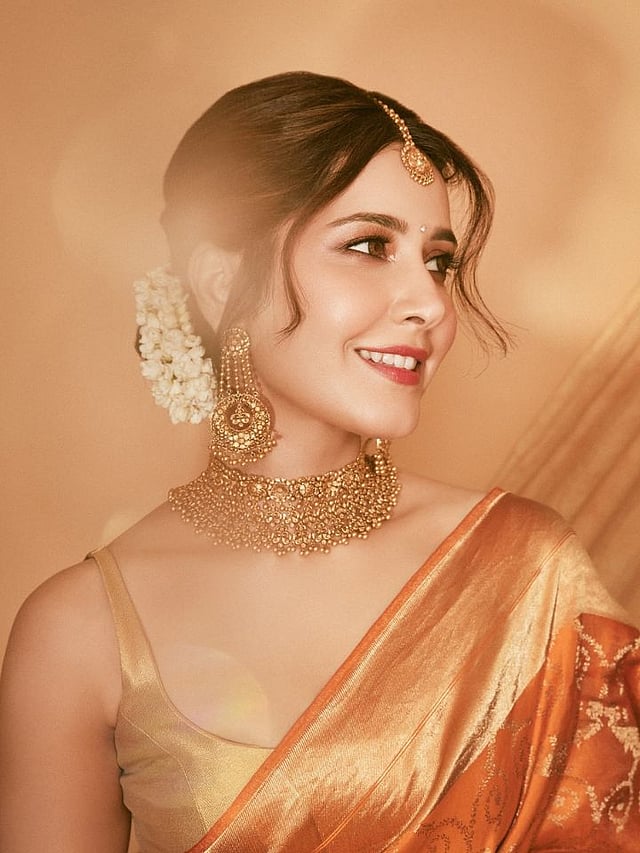 लग्नासाठी बॉलिवूड अभिनेत्री राशी खन्नाने नारंगी रंगाची साडी नेसून उपस्थिती लावली होती.