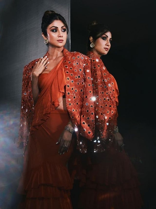 फोटोंमध्ये शिल्पाचा मल्टीलेयर साडीमध्ये बोल्ड लूक पाहायला मिळत आहे.