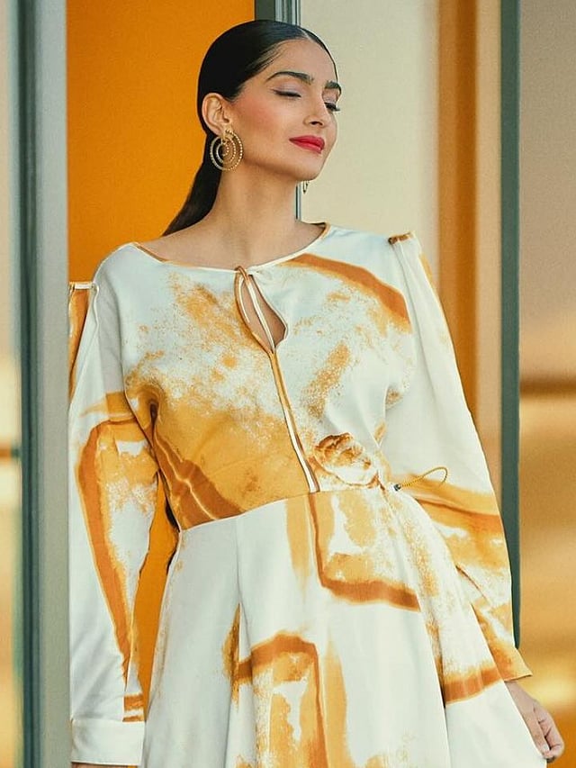 शेअर केलेल्या फोटोंमध्ये, सोनमने कॉटनचा मल्टिकलर वेस्टर्न आऊटफिट परिधान केलेला आहे.