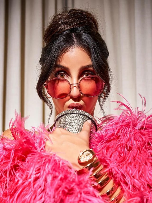 नोराने गोल्डन स्कर्ट आणि टॉप परिधान केला आहे ज्यामध्ये नोरा किलर दिसत आहे.