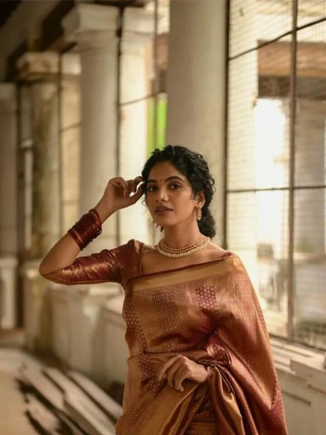 रिच आणि रॉयल लुकसाठी ब्राउन सिल्क साडी उत्तम पर्याय आहे. खासकरून लग्नसमारंभ किंवा सणासाठी योग्य.