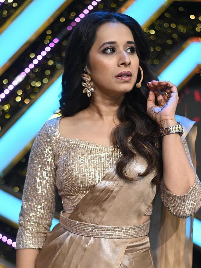 श्रेयाने सुंदर वेस्टन लूक केला आहे. तिने गोल्डन साडी नेसली आहे.